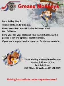 Bring you car, your tools, your work list, a chair, your lunch and adult beverages. Or just come chat with your friends in the car club. Below are the links to the details as well as driving instructions to the diner and Henry Bos’ place.